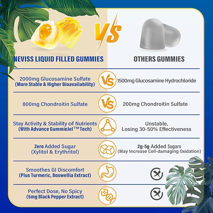 • THE FIRST GLUCOSAMINE LIQUID-FILLED GUMMIES - Wave farewell to bulky glucosamine chondroitin capsules. Our glucosamine chondroitin MSM liquid-filled gummies are adopted with advanced GummieJel gummy-filled Technology that locks in active ingredients sensitive to temperature or pH, as well as lipophilic ingredients like turmeric curcumin, at the center, to ensure stability and improved solubility in the gastrointestinal tract, ultimately enhancing overall absorption and bioavailability.