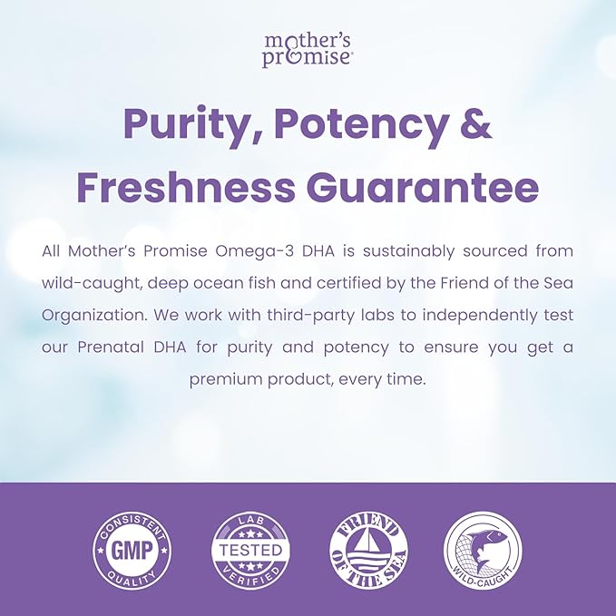 • Purity, Potency & Freshness Guarantee - All Mother’s Promise DHA is sustainably sourced from wild-caught, deep ocean fish and certified by the Friend of the Sea Organization. We also work with Third-Party labs to test for purity and potency.