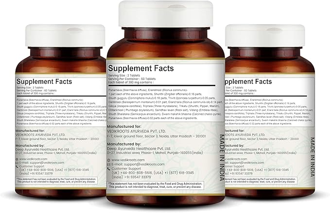 • Helps Kidney & Liver: Vedikroots Punarnavadi Guggulu tablets promote healthy kidney and liver function, helping your body detoxify and stay balanced.