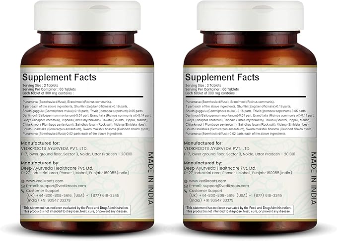 • Formulation: Vedikroots Punarnavadi Guggulu tablets are crafted using special herbs from the ancient tradition of Ayurveda, and are used as a diuretic & to treat swelling issues.