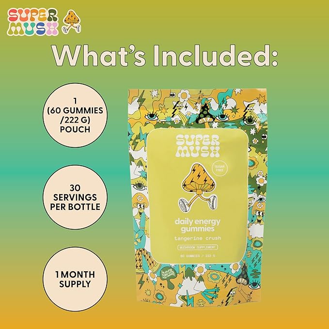 SuperMush Energy Mushroom Gummies - Organic Lions Mane Supplement with Cordyceps, Rhodiola, L-Theanine, Maca - Vegan & Sugar-Free - Energy, Focus, Stamina, Stress Reduction - 60 Gummies (30 Servings)
