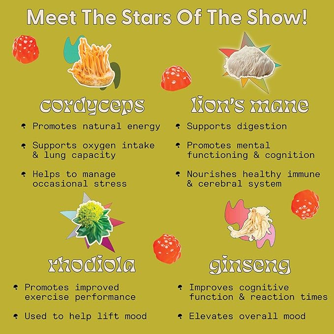 • ENHANCED WITH RHODIOLA & GINSENG EXTRACTS - For extra energy & stamina, we've included Rhodiola & Panax Ginseng extracts in our mushroom supplement. Rhodiola, an adaptogen from high-altitude regions, reduces fatigue & supports endurance. Panax Ginseng, used in traditional Chinese medicine, improves mental performance & energy. These herbs enhance our mushroom gummies for adults with natural ingredients, making them an ideal substitute for caffeinated energy pills and other energy supplements.