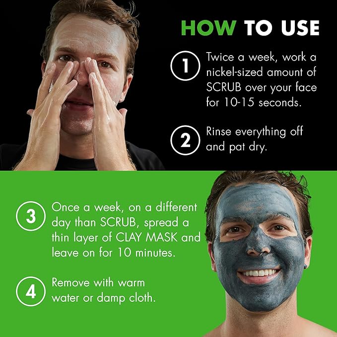 • How to Use: Twice a week, rinse your face with water and work a nickel-sized amount of SCRUB over your face for about 10-15 seconds. Then rinse everything off with warm water. Once a week, spread a thin layer of CLAY MASK over your face, making sure to avoid the eyes and mouth. Leave on for 10 minutes and remove with warm water or a damp cloth. Make sure to use SCRUB on a different day than CLAY MASK.