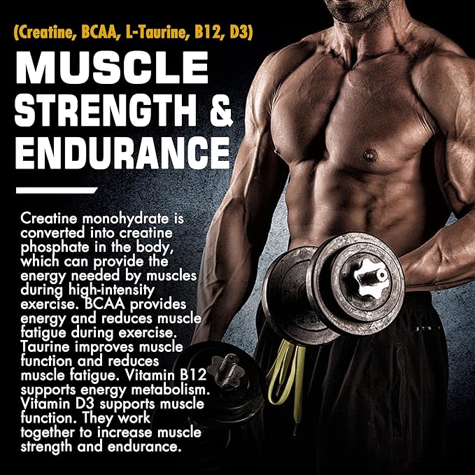 • ⚡💪【MUSCLE】Creatine monohydrate is converted into creatine phosphate in the body to provide muscles with the energy required during high-intensity activity. Plus high-quality ingredients B12, D3, ect, they work synergistically to help replenish ATP levels in muscles.