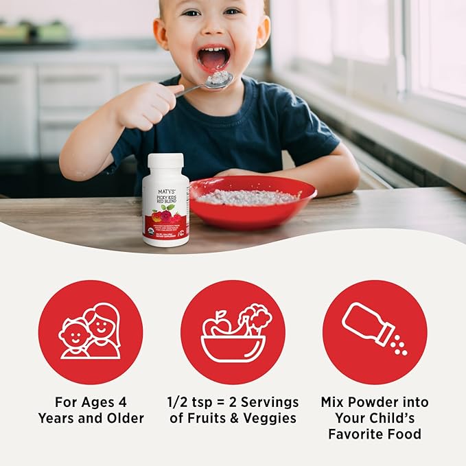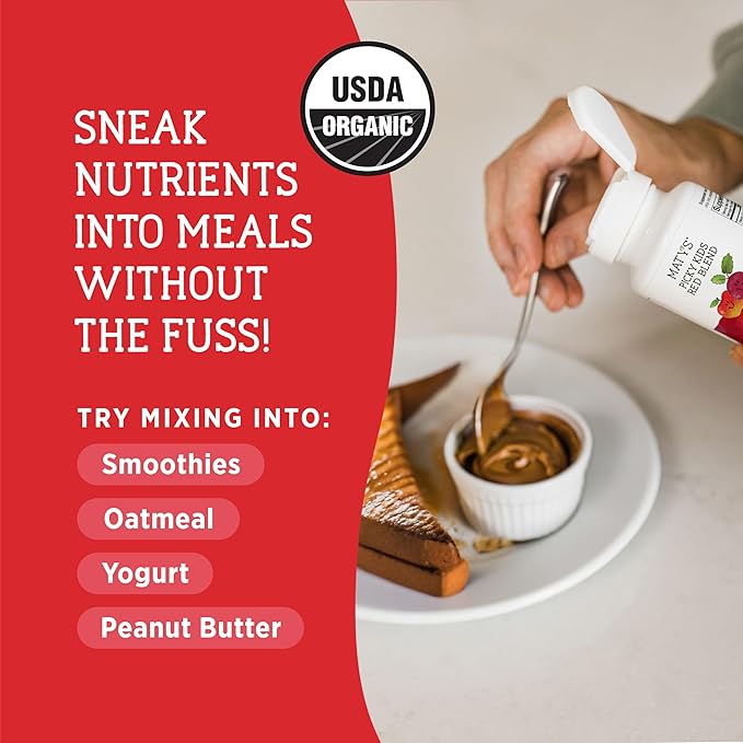 Matys Organic Picky Kids Red Blend, Fruit and Veggie Powder Supplement, Picky Eater Vitamins for Kids 4 Years +, Childrens Superfoods Powder for Meals with Berries, Beets, & Bananas, 1.6 Ounces