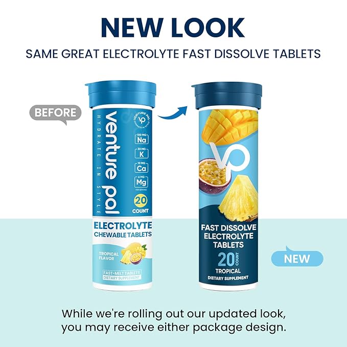 • VENTURE PAL ELECTROLYTE CHEWABLE TABLETS: Introducing our newest innovation, the Chewable Bite-sized Fast-Melt Electrolyte Tablets that take effect almost immediately. Rich in essential electrolytes - sodium, magnesium, potassium, and calcium - they replenish vital electrolytes lost through sweating, helping to maintain hydration during daily exercise and endurance training, reduce heat stress, and alleviate leg cramps