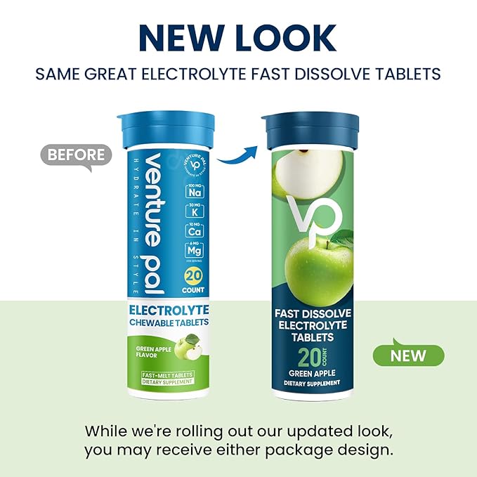 • VENTURE PAL ELECTROLYTE CHEWABLE TABLETS: Introducing our newest innovation, the Chewable Bite-sized Fast-Melt Electrolyte Tablets that take effect almost immediately. Rich in essential electrolytes - sodium, magnesium, potassium, and calcium - they replenish vital electrolytes lost through sweating, helping to maintain hydration during daily exercise and endurance training, reduce heat stress, and alleviate leg cramps