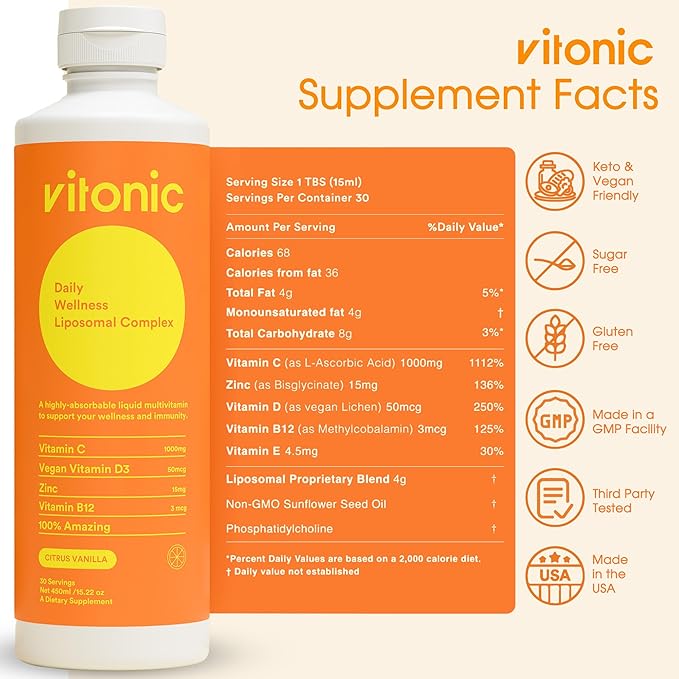 • Feel the Difference with Vitonic: Our cutting-edge liposomal technology ensures efficient nutrient absorption, helping your body thrive with every dose.