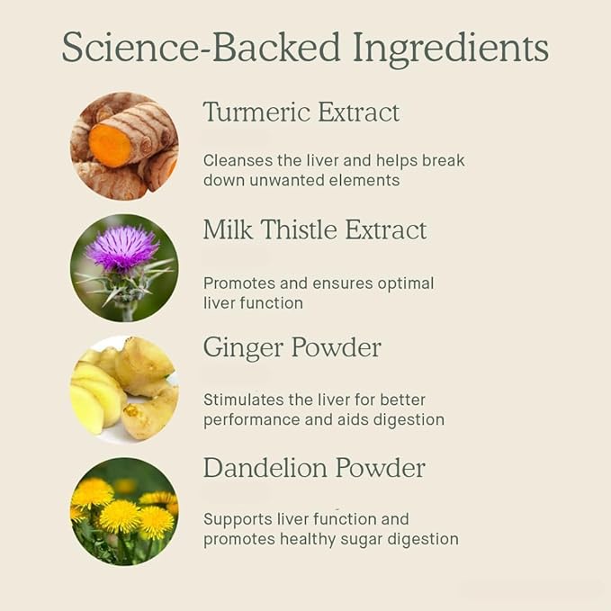 • NATURAL INGREDIENTS: Made with Organic Turmeric Extract, Organic Dandelion Powder, Organic Milk Thistle extract and Organic Ginger Powder.
