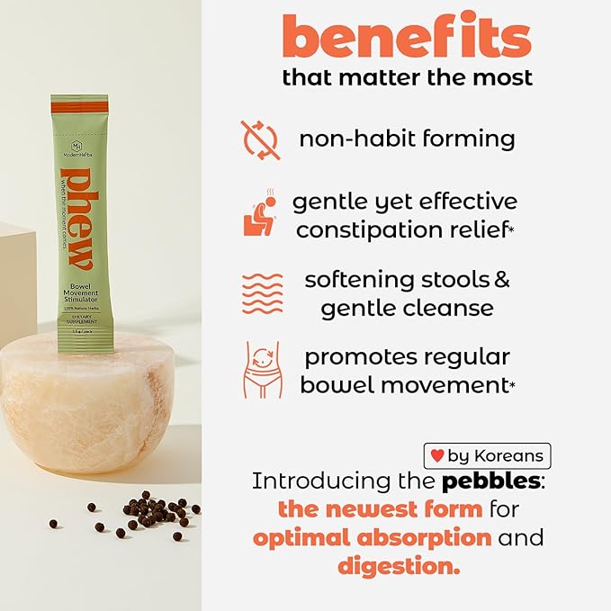 • STIMULANT-FREE COLON CLEANSE: These herbal medicine-based pebbles work with your body for gentle, effective constipation relief without harsh stimulants. Traditional laxatives can lead to dependency and disrupt your digestive system, but Phew's stimulant-free formula ensures a natural, non-addictive approach to regularity. It's perfect for those seeking a gentle, reliable solution that won't interfere with your body's natural processes, providing a smooth and comfortable experience.