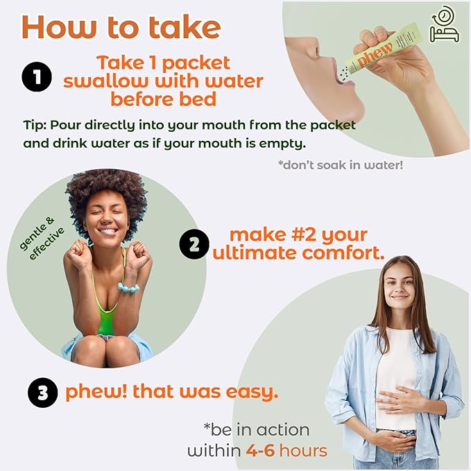 • CONSTIPATION RELIEF MADE EASY: Phew helps you comfortably manage your constipation and gut health with no harsh side effects, promoting regularity and overall wellness. By addressing the root cause of constipation and supporting a healthy digestive system, Phew empowers you to take control of your gut health. Regular use can lead to improved digestion, better nutrient absorption, and a healthier, more vibrant you. Say goodbye to discomfort and hello to a balanced, happy gut.