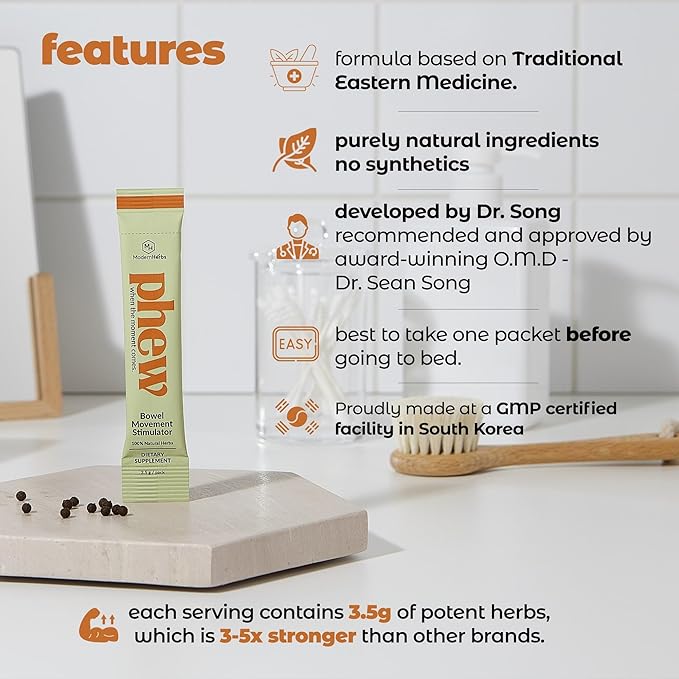 • KOREAN HERBAL COLON CLEANSE DETOX: Developed by doctors, Phew promotes a healthy gut and comfortably eases constipation with Korean ingredients. Unlike harsh laxatives that can cause cramping and discomfort, Phew's unique formula ensures a gentle, soothing experience. It supports regular bowel movements, reducing the strain and discomfort often associated with constipation. Experience a natural way to cleanse your colon and maintain gut health with Phew.