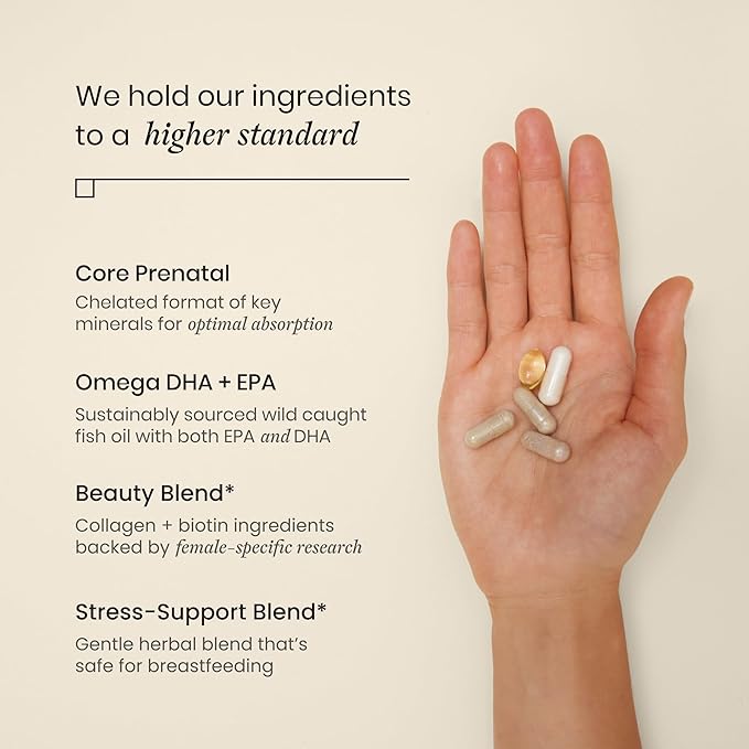 • Beauty + Anti-Stress Blends - We created these postnatal vitamins for women who want comprehensive, well-rounded support; which is why we've included 1 capsule of our Beauty Blend to support your hair skin + nail health, and 1 antioxidant-rich capsule of our Anti-Stress blend to support a strong emotional balance.