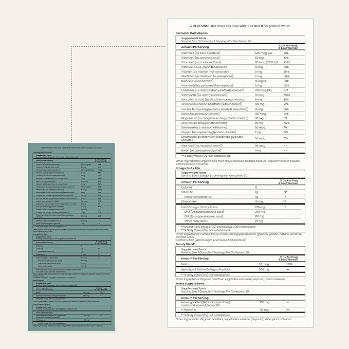 • Supporting New Mothers - After baby is born, we often forget about the important role of post natal vitamins and postpartum supplements. This simple, daily vitamin routine makes it easy to cover all your bases, and includes a full-spectrum multi vitamin, omega DHA + EPA, beauty blend and anti-stress blend.*