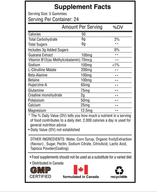 • Increased Pump - Our gummies are specifically formulated to increase muscle pumps during your workouts. Simply take 3-5 gummies before your workout for an added dose of L-Citrulline and Beta-Alanine, delivering the boost you need.