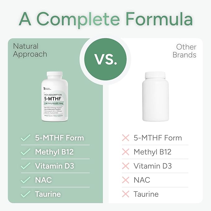 • 5-IN-1 FORMULA: Unlike our competitors, we go beyond the standard methylated folate and b12 combo to provide a more complete formula. Our supplement is further enhanced with NAC, Taurine, and Vitamin D3.