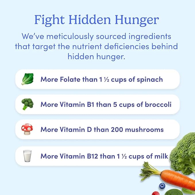 • Real Wholesome, Real Results You Can Feel: Our kids multivitamin gummies are designed to address hidden hunger left by modern childhood diets; made with 12 organic fruits and veggies, this supplement focuses on the 9 micronutrients that children most commonly lack