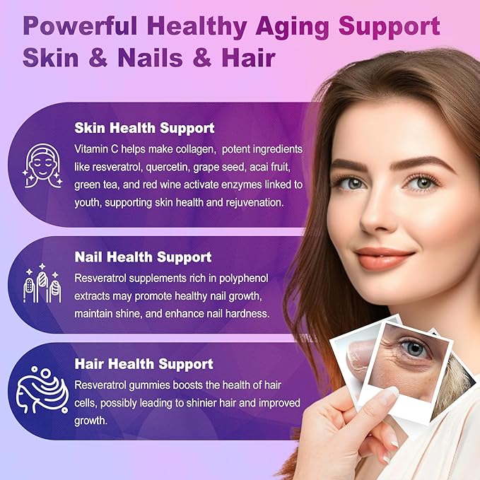 • [Retain Youth, Healthy Aging Supplement]: Resveratrol Supplement - Recognized as a natural, powerful healthy aging supplement, 98% extracted from organic knotweed root, as high-purity trans-resveratrol, more bio Utilization and maximum health benefits. Our resveratrol gummies help skin, nails, and hair rejuvenate, don't fear the years, may can do less useless work on the road to healthy aging.