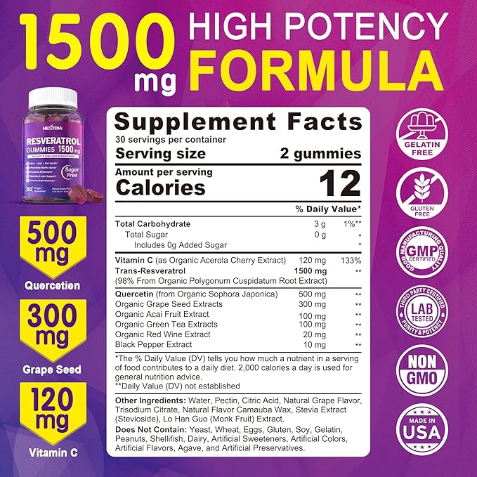 Resveratrol Gummies 1500mg - Resveratrol Supplement with Quercetin, Grape Seed, Red Wine, Black Pepper Extracts Support Antioxidant, Healthy Aging & Brain Wellness - Vegan, Natural Grape Flavor, 60Ct
