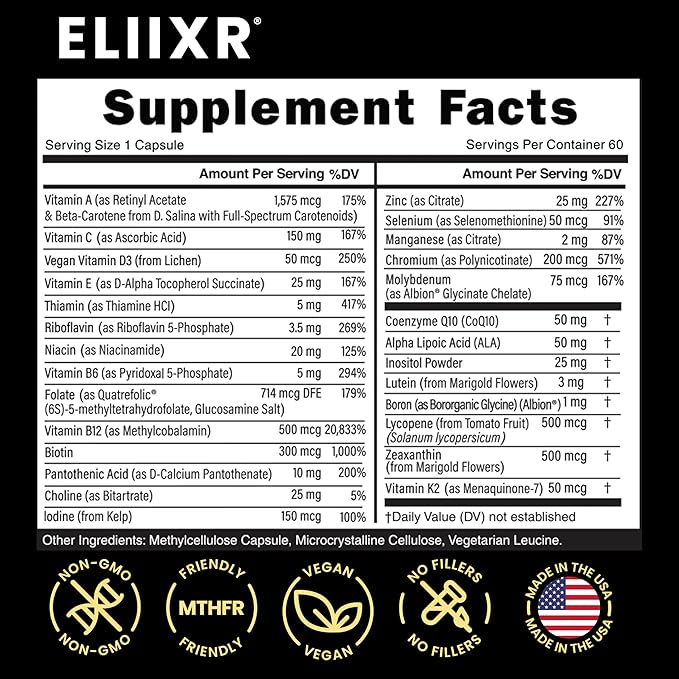 • Convenient daily dose: Each easy-to-swallow vegetable capsule delivers 27 natural vitamins and micronutrients, including zinc, selenium, choline, and potent antioxidants like CoQ10, alpha-lipoic acid, and lutein. These supplements provide essential nutrients in a single daily serving.