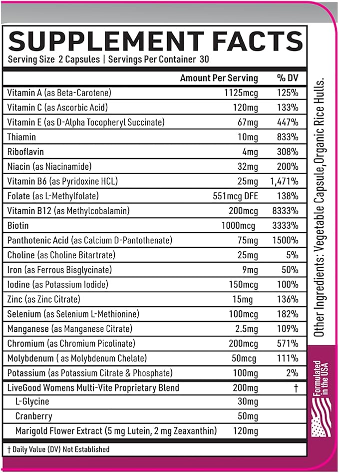 LIVEGOOD™ Women's Bio-Active Complete Multivitamin with Iron, Vitamin A, B12, C, E, Lycopene, Vegan, 60 Capsules