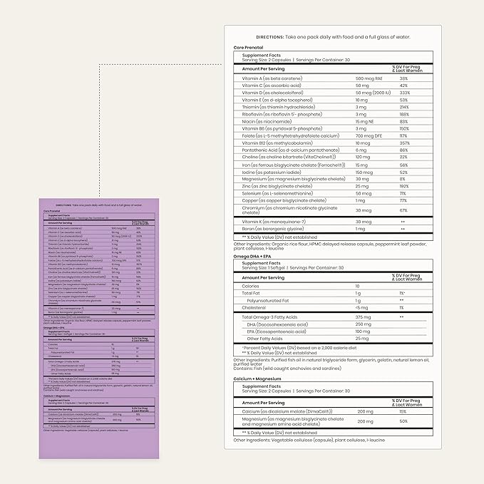 • What's Inside - Each pack contains two Core Prenatal capsules, one Omega 3 DHA + EPA softgel and two Calcium and Magnesium women's vitamins. Our Omega softgel uses prenatal DHA to support your baby's brain, eyes and central nervous system and EPA to support their heart and immune system.*