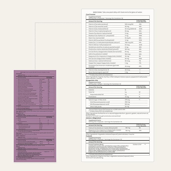 • What's Inside - Each pack contains two Core Prenatal capsules, one Omega 3 DHA + EPA softgel, one Calcium and Magnesium womens multivitamin and one probiotic. Each pill pack represents a full day's worth of pregnancy vitamins, and should be taken daily with food and water.