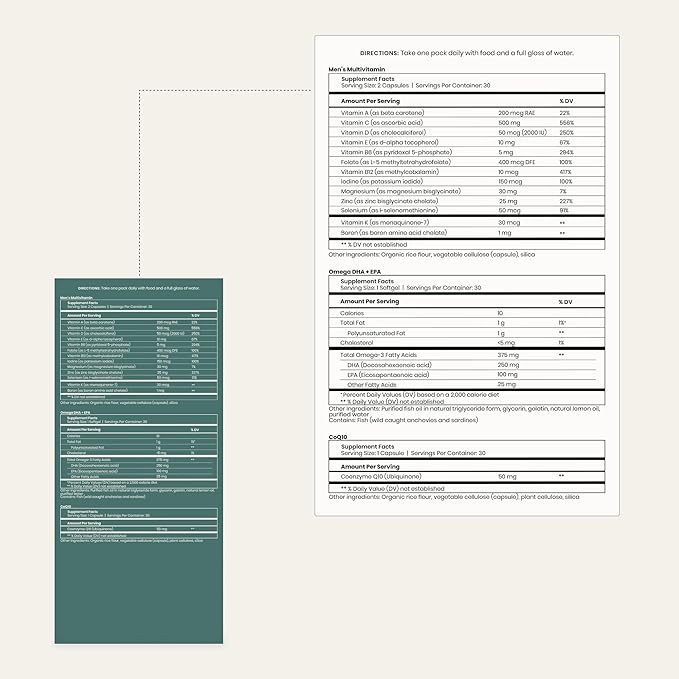 • What's Inside - Our Men's Multi Support packs include two Mens Multivitamins, one Omega DHA + EPA softgel, and one CoQ10 capsule. Each pill pack represents a full day's worth of men's vitamins, and should be taken with food and water.