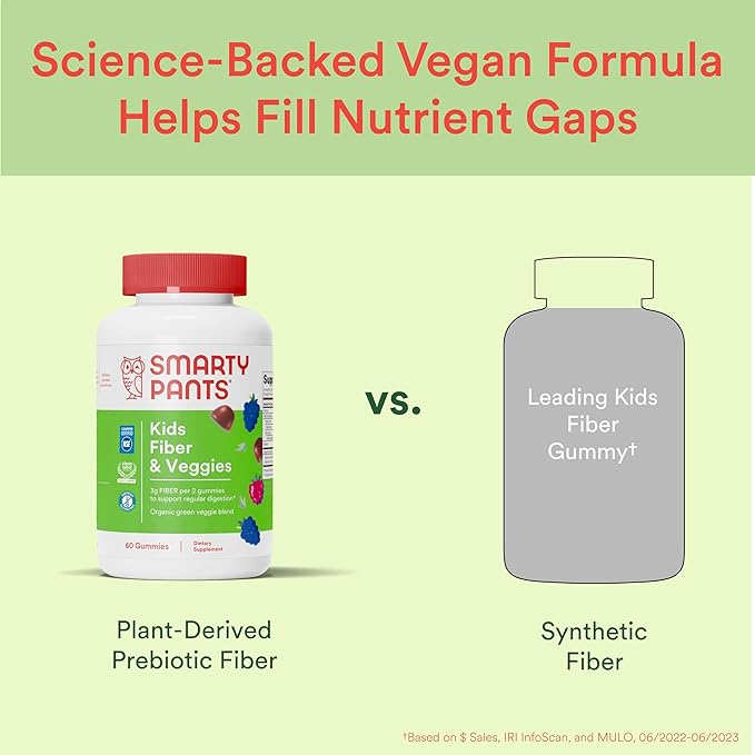 • SCIENCE-BACKED FIBER GUMMIES FOR KIDS: SmartyPants Kids Fiber & Veggies is specifically formulated to support regular digestion* in kids 4+ with prebiotic dietary fiber, inulin, and an organic green veggie blend of organic kale, spinach, and broccoli