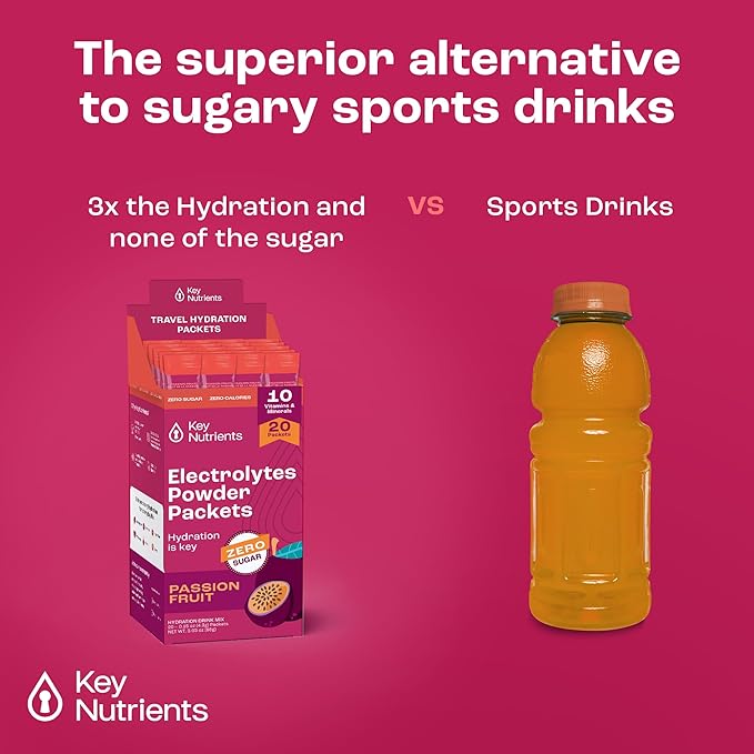 KEY NUTRIENTS Multivitamin Electrolytes Powder Packets - Delicious Passion Fruit 20 Pack Hydration Packets - Travel Hydration Powder - No Sugar, No Calories, Gluten Free - Made in USA