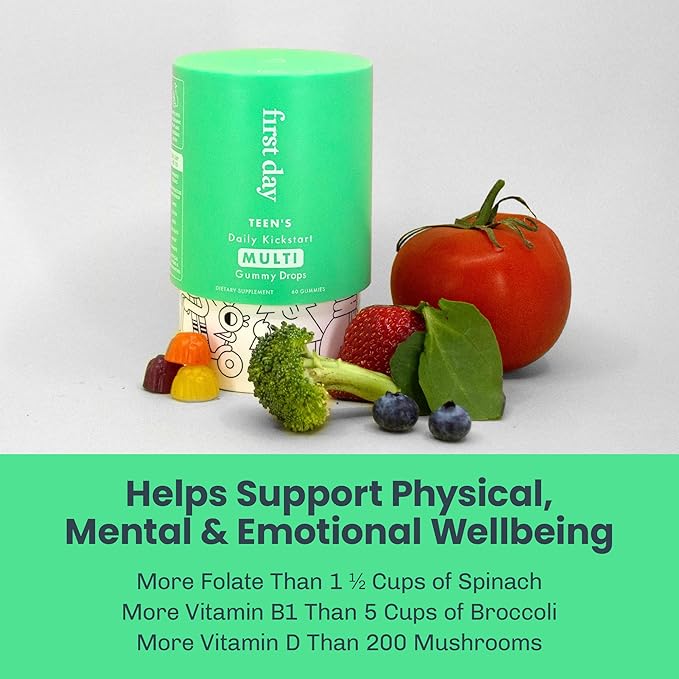 FIRST DAY Teens Daily Kickstart Multivitamin Gummies for Ages 14+ – Vitamins A, B1, B2, B6, E, B12, C, D3 & K2 + Zinc & Folate – Made w/Organic Fruits & Veggies, Only 2g Sugar – 30 Day Supply