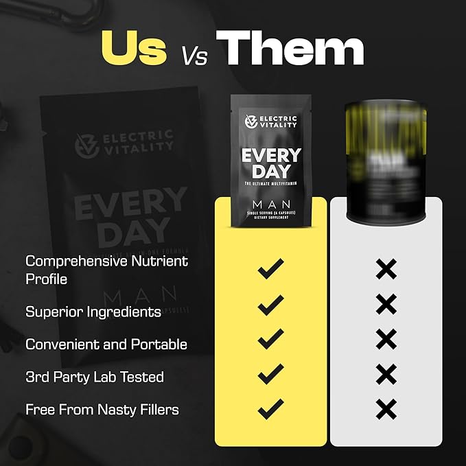 • On-the-Go Vitality - Don’t let a hectic schedule, traveling or long hours at the office get in the way of being a superior man. Slip a sachet of Electric Vitality Man daily mens vitamins into your pocket to stay on top of your game anytime, anywhere