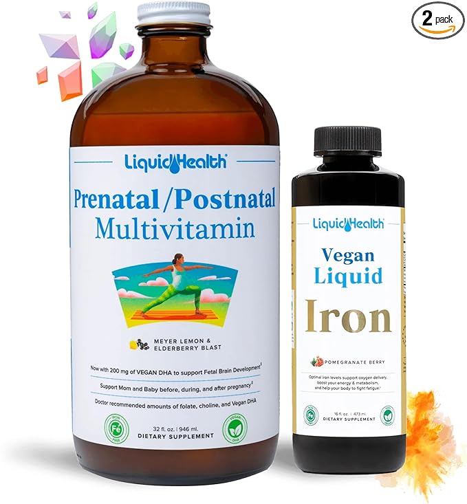 • THE ULTIMATE BABY BOOSTER PRENATAL VITAMIN BUNDLE FOR MOMS TO BE: Achieve optimal health and wellness on your pregnancy journey with Liquid Health's Prenatal/Postnatal Liquid Multivitamin and Vegan Liquid Iron supplement! Whether you're trying to conceive or months into your pregnancy, this Prenatal bundle will provide you with all the essential vitamins, minerals, and whole foods you and your growing baby need.