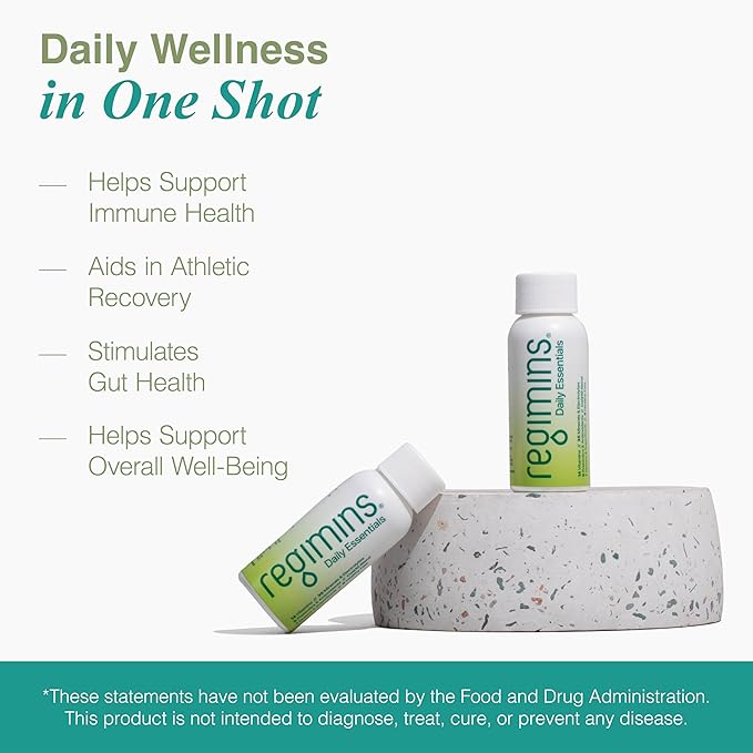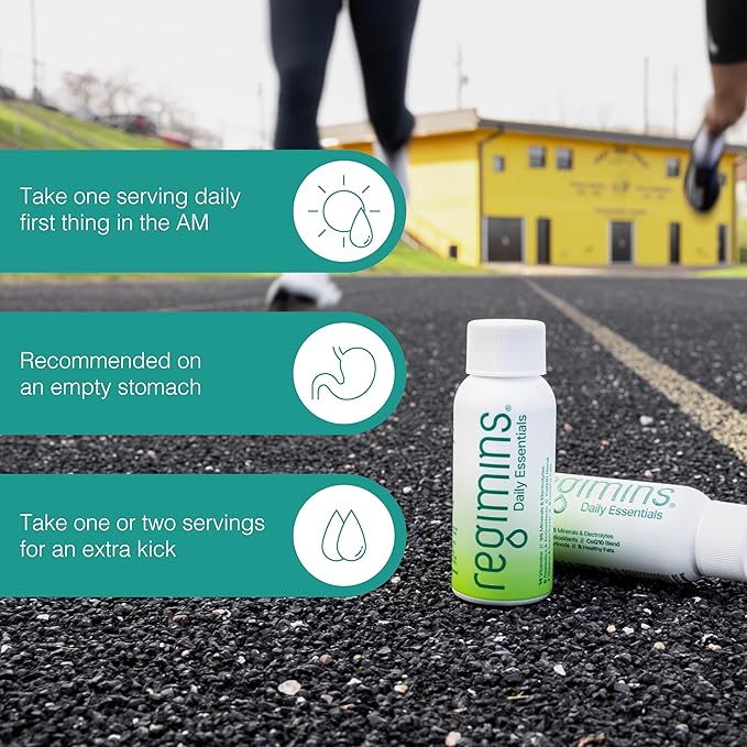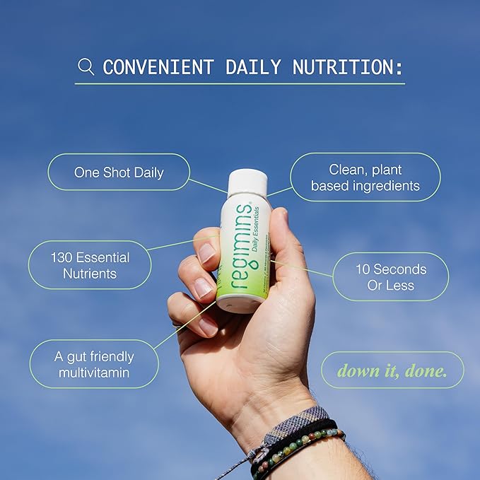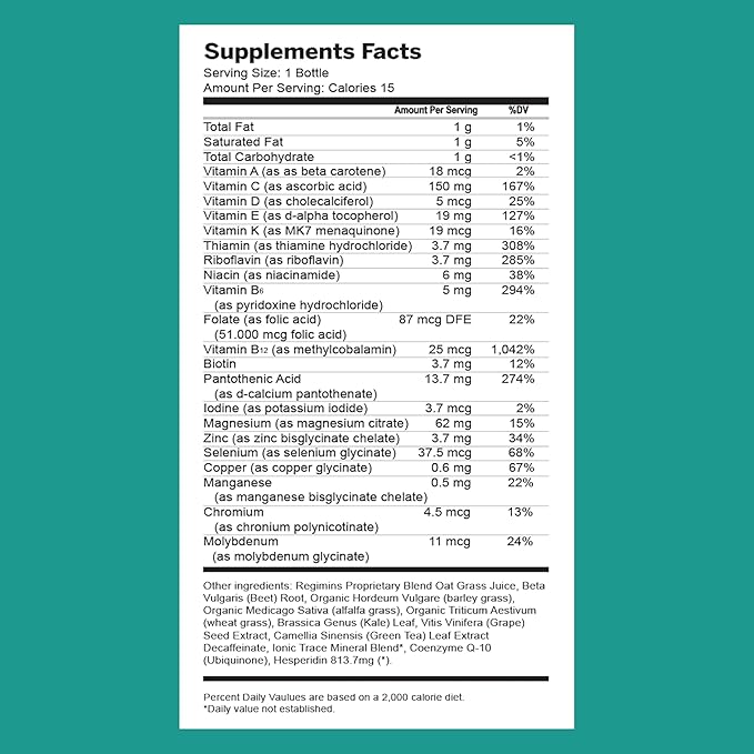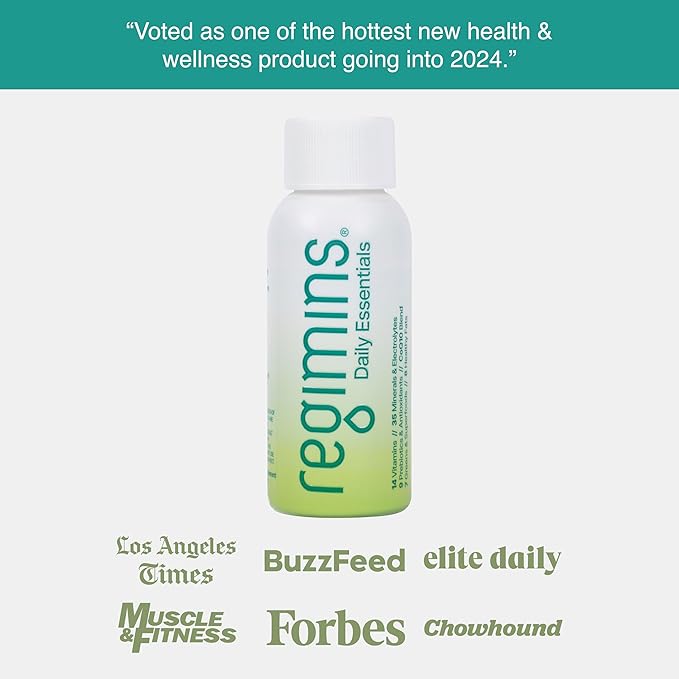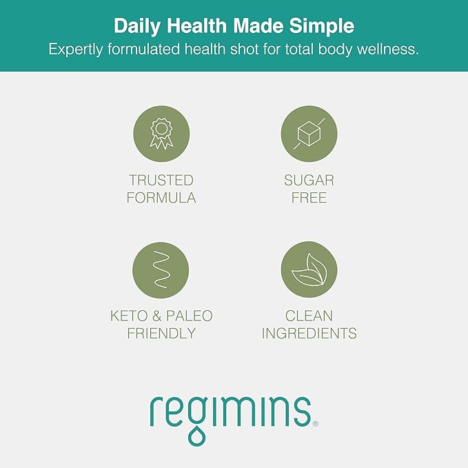 • LIQUID DIETARY SUPPLEMENT: Regimins is a daily health shot, designed to replace your daily vitamin stack by condensing your recommended nutrient intake into one all-encompassing product with only 15 calories and less than a gram of carbs and fats