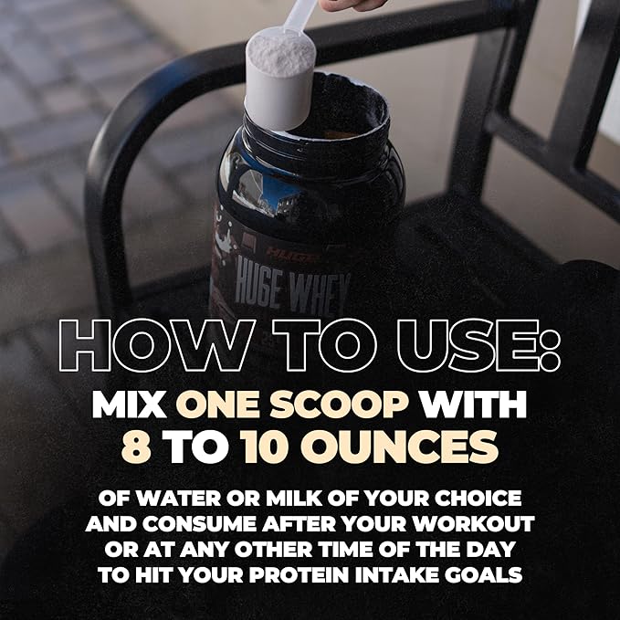 • Easy Mixability & No Clumping: Huge Whey Protein is designed for easy mixability, ensuring a smooth and lump-free shake every time. Whether you mix it with water, milk, or your favorite beverage, our protein powder dissolves quickly and thoroughly. This convenience means you can prepare your shake on the go, making it perfect for busy lifestyles. No more dealing with clumps or residues; just a perfectly blended delicious shake that delivers all the nutritional benefits you need.