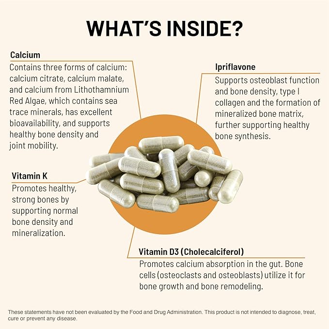 • QUALITY INGREDIENTS: Our formula contains essential bone-building vitamins and minerals, as well as Ipriflavone, which supports osteoblast function, bone density, type 1 collagen, and the formation of mineralized bone matrix.