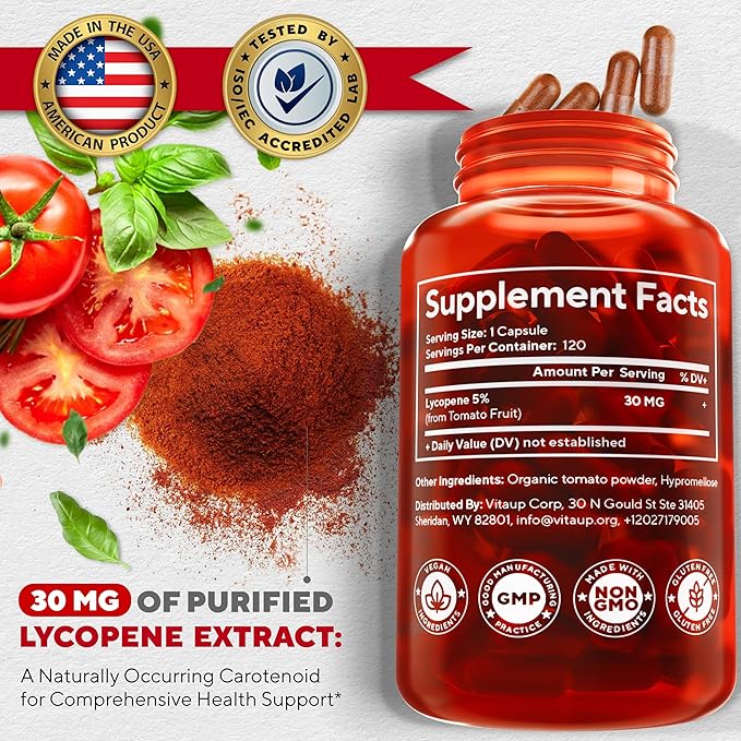 • POTENT TOMATO BOOST: VitaUp lycopene supplement is made with a concentrated tomato extract sourced from natural tomato fruits. Carotenoids, powerful antioxidants found in tomatoes, enhance our formula to provide comprehensive support for your overall well-being.*