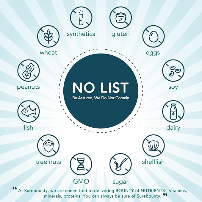 • No Allergens or Nasties: Surebounty has always been dedicated to formulating supplements that cater to people from all walks of life and can easily fit into their daily routines. We want you to enjoy the amazing benefits brought by our products without worrying about getting allergic. Be Assured: NO GMOs, soy, gluten, milk, sugar, egg, wheat, corn, nut, fish, shellfish. And never will you find Nasties like artificial ingredients, fillers, binders, or preservatives in Surebounty!