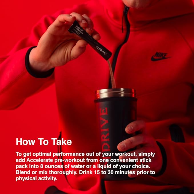 • To get optimal performance out of your workout, simply add Accelerate pre-workout from one convenient stick pack into 8 ounces of water or a liquid of your choice; blend or mix thoroughly and drink 15 to 30 minutes prior to physical activity