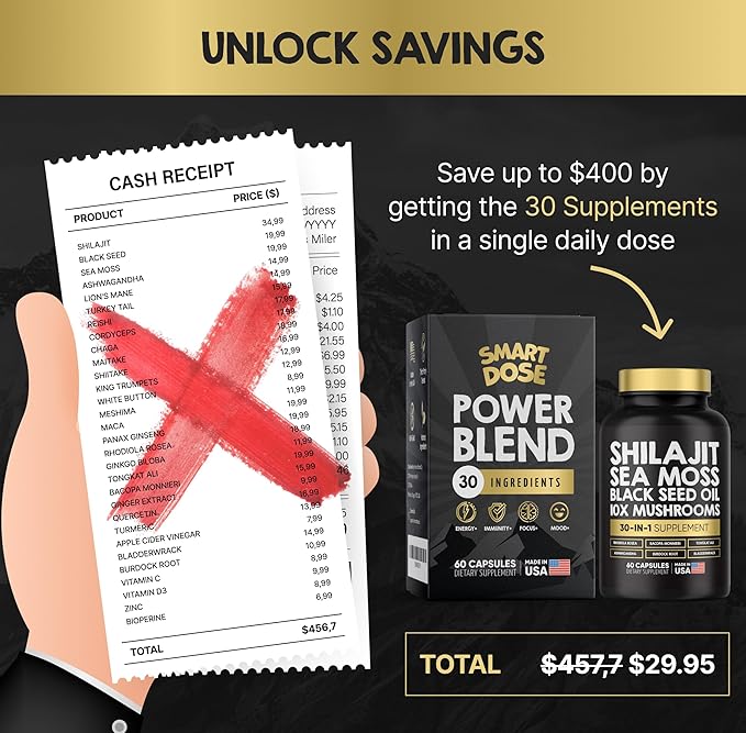 Power Blend Capsules - 30-in-1 Supplement Bundle with Shilajit 6000mg, Sea Moss 4000mg, Black Seed Oil 4000mg, Ashwagandha 2000mg, 10x Mushrooms, Tongkat Ali, Maca, Holistic Pills Combo