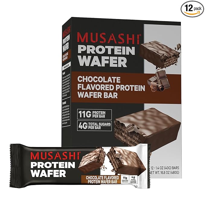 MUSASHI Protein Wafer Bar, 11g Protein, 4g Total Sugars, Chocolate Flavored, Post Workout and Protein Snack On The Go, 12 Pack of 1.4oz (40g) Bars