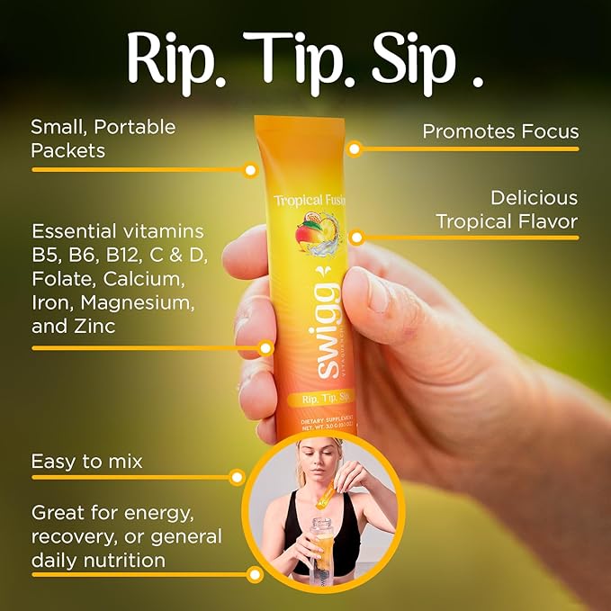 • Pure Hydration Packets - Feel the buzz with Swigg’s electrolytes powder no sugar packets. This tropical flavored electrolyte drink mix makes hydration easy and tap water delicious. Just rip, tip, and sip for a refreshing surge of energy and focus