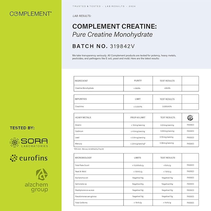 Complement Creatine Monohydrate Micronized Powder for Women and Men (5g, 60 Servings) Pre Workout, Post Workout, Muscle Recovery, Brain Health, Longevity- Vegan, Unflavored