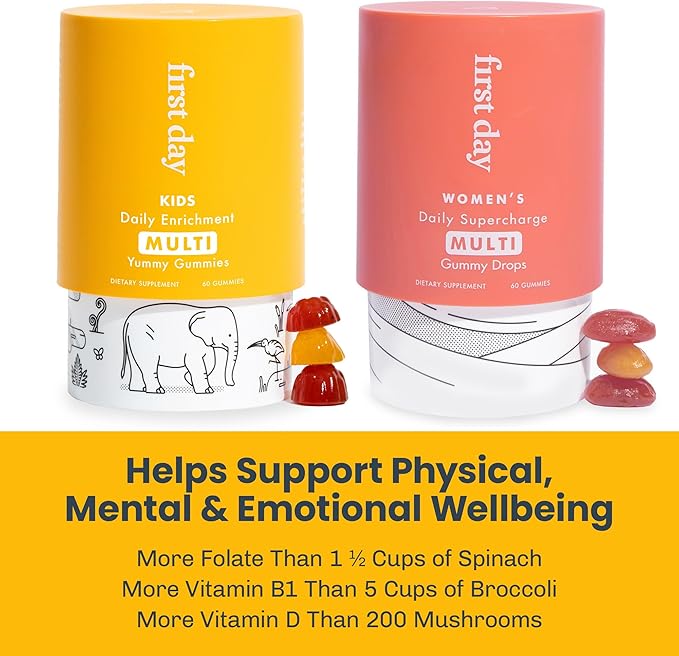 FIRST DAY Multivitamin Gummies Bundle for Women & Kids – Vitamins A, B, C, D & K + Folate, Magnesium, Zinc, Biotin & More – Made w/Organic Fruits & Veggies, Only 2g Sugar – 2-Pk, 30 Day Supply Each