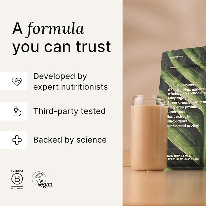 • ULTIMATE SUPERFOOD MEAL: With more than 87 vitamins, minerals and wholefood-sourced nutrients, daily superblend is the perfect breakfast or mid-day energy boost.