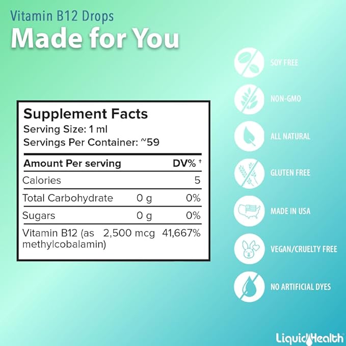• MAXIMIZE YOUR NATURAL ENERGY: Liquid Health's Vitamin B12 Drops contain 2500 mcg of Methylcobalamin, an easy-to-absorb form of Vitamin B12. These essential liquid B-supplement drops help to enhance your body's natural energy levels to fight fatigue and weakness, giving you a sustained energy boost throughout the day!