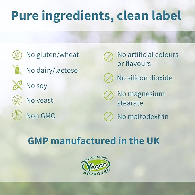 • PURE & CLEAN: tested for heavy metals, lab-verified ingredients, no unpleasant fillers (silicon dioxide, magnesium stearate or titanium dioxide), GMP manufactured in the UK, recyclable & BPA-free, vegan