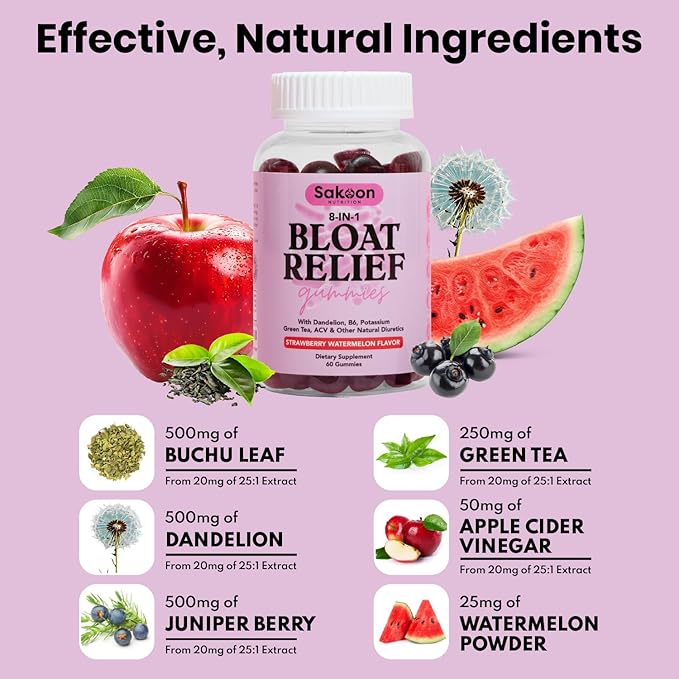 Sakoon nutrition Bloating Relief Gummies for Women - Green Tea, ACV, Dandelion, Buchu Leaf, Natural Digestion Support, 60 Gummies, Watermelon Flavor