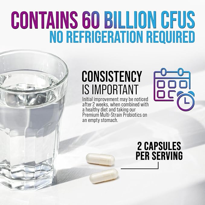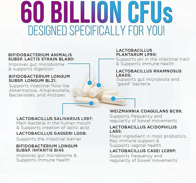 • Probiotic Pills: Each capsule delivers 60 Billion CFU with acidophilus and other beneficial strains to support gut and digestive health for both women and men