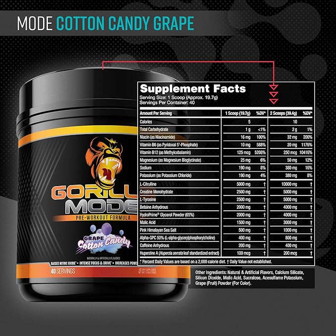 Gorilla Mode Pre Workout - Massive Pumps · Laser Focus · Energy · Power - L-Citrulline, Creatine, L-Tyrosine, Betaine, Hydroprime®, Alpha-GPC, 400mg Caffeine, Huperzine A – 786g (Cotton Candy Grape)